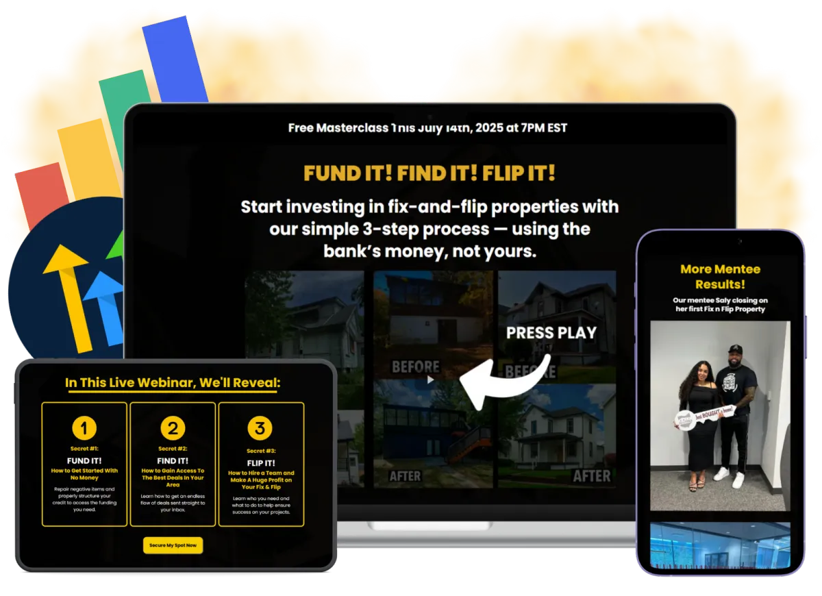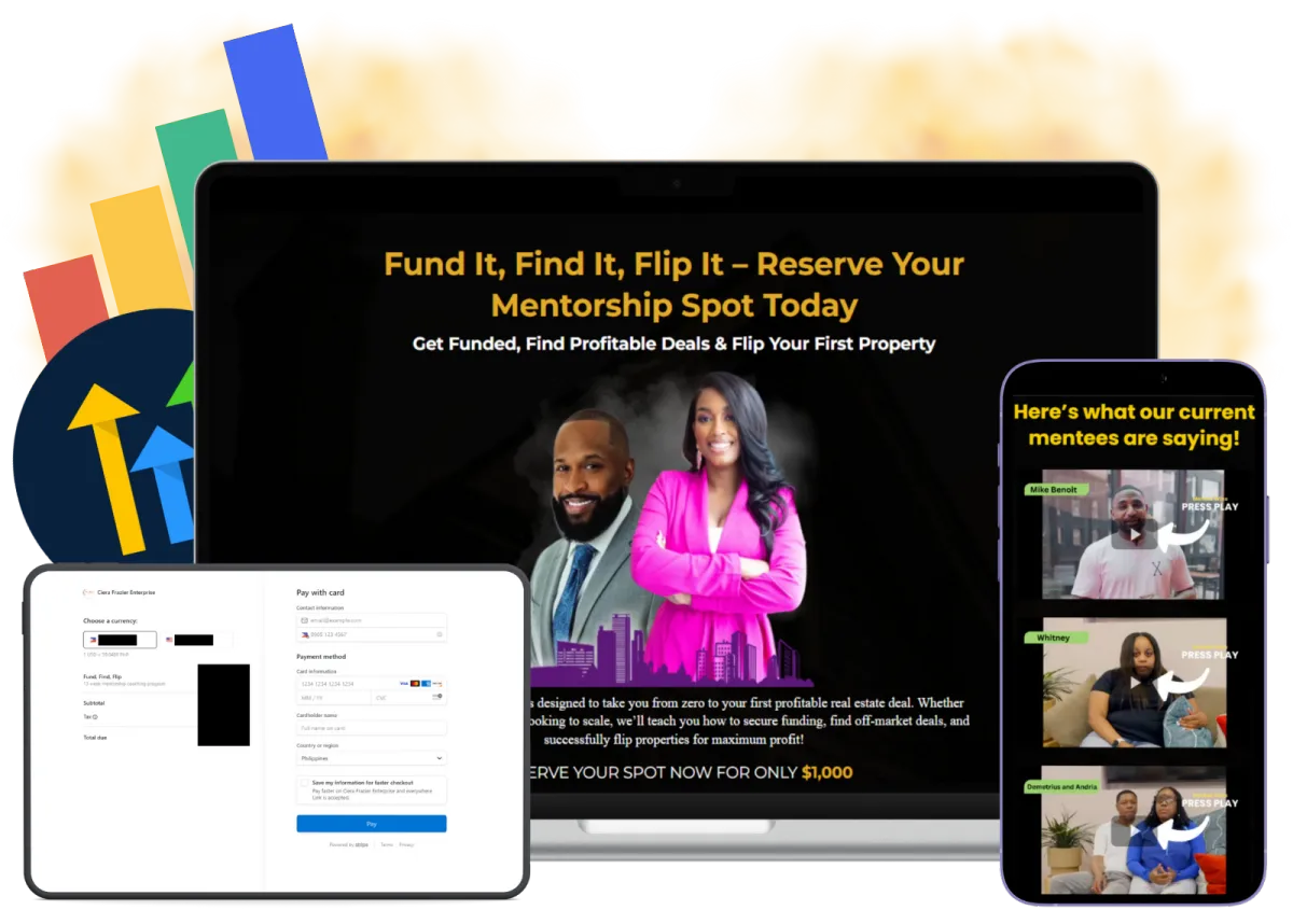 Sales funnel for a real estate funding mentorship program. Includes persuasive copy layout, lead opt-in, and integration with CRM sequences.
