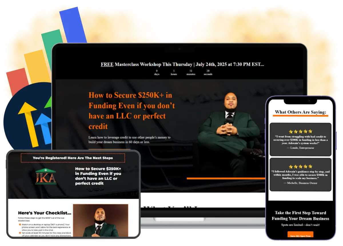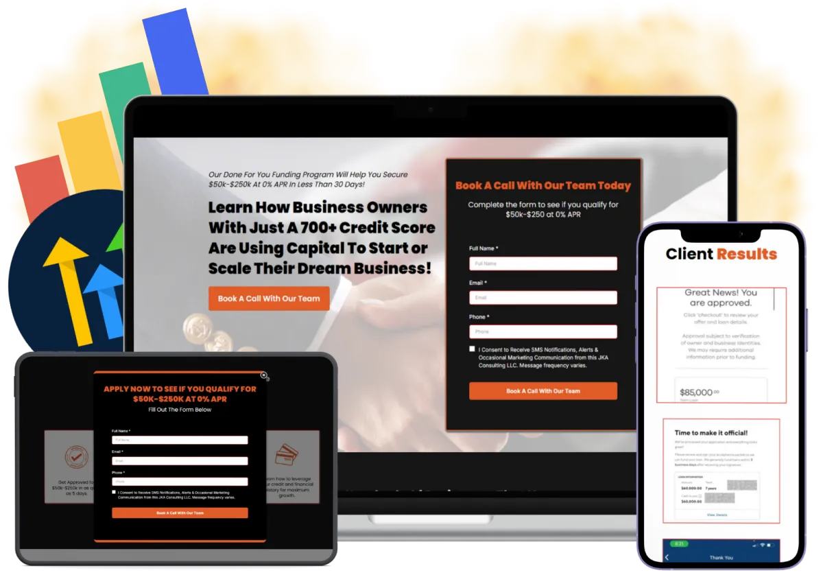 Targeted funnel for business owners seeking funding solutions. Includes credibility-building layout, lead qualifying questions, and automated appointment booking.
