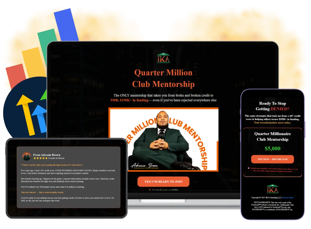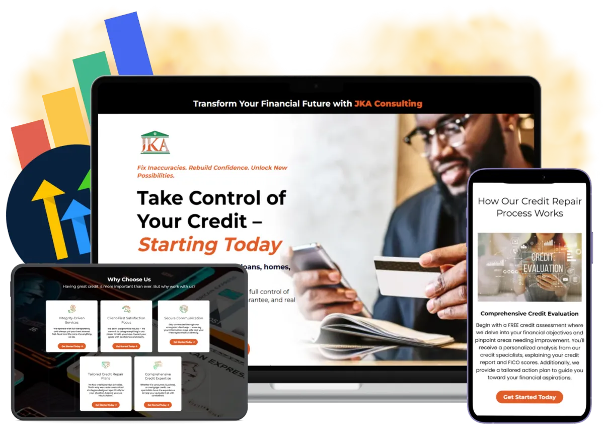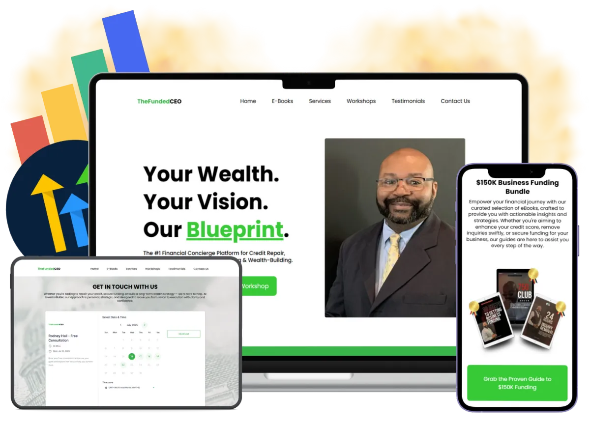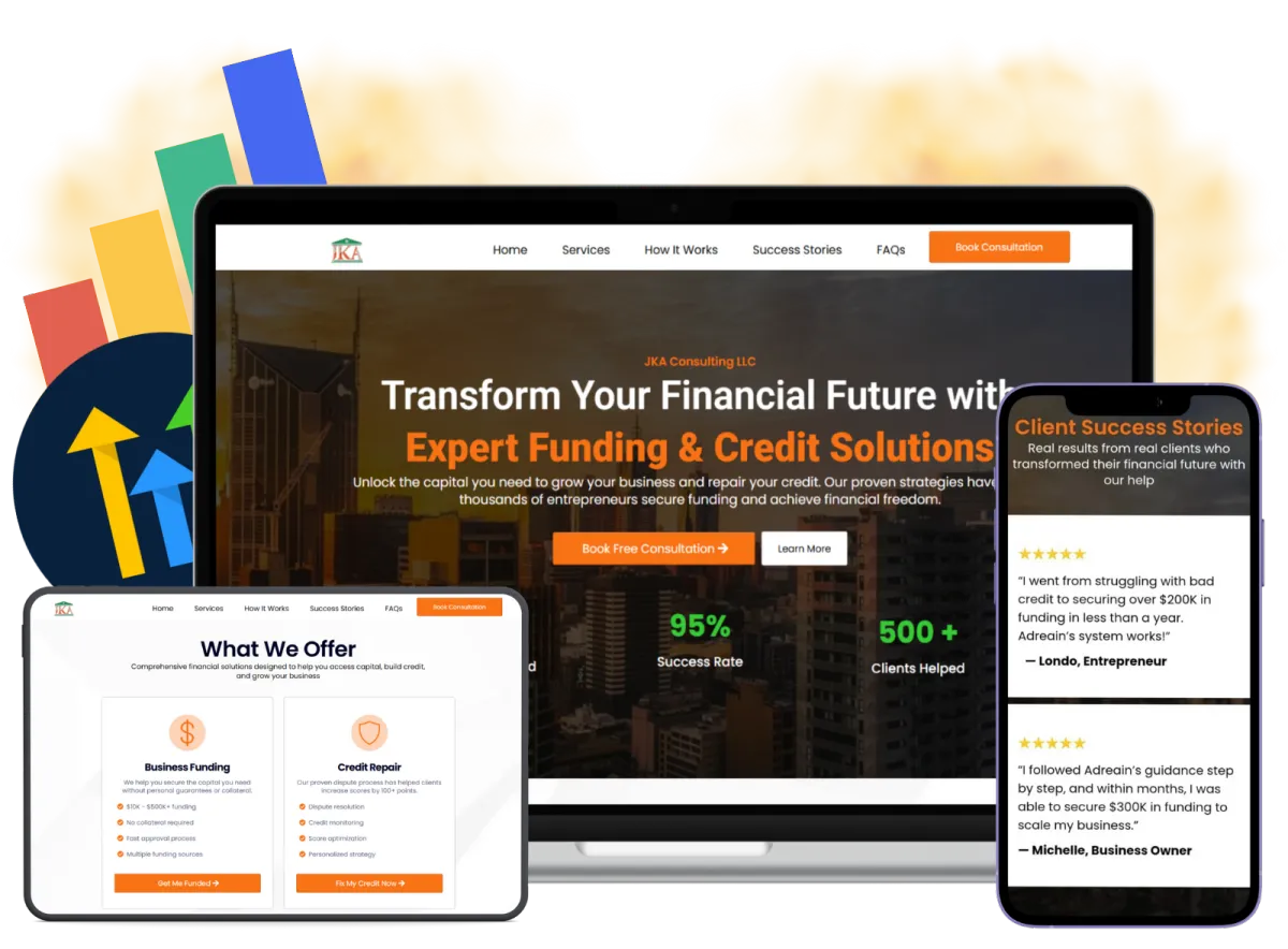 Website for consulting agency services (funding, credit, education). Funnel connections for lead capture, opt-ins, and nurture automations.